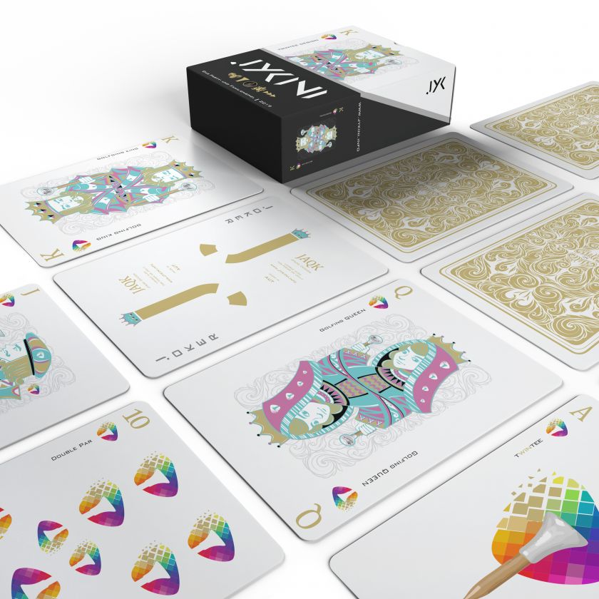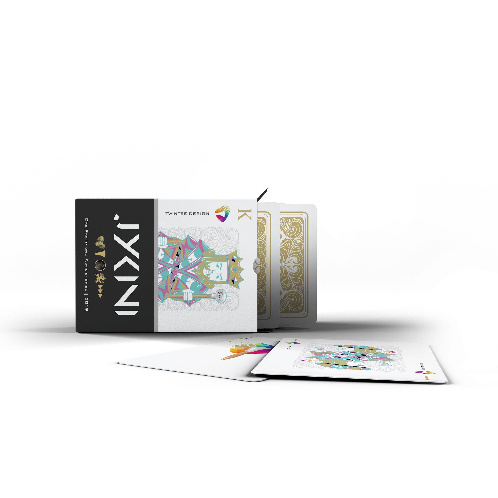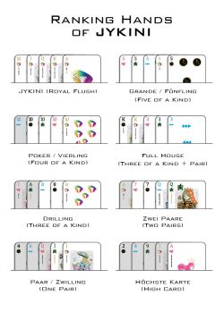 The card game consists of game situations from Texas Holdem Poker and the dice game Mäxchen “21” (or Meier). The game can be played in duel, from 1 to 13 cards or with up to 13 players from 1 to 4 cards. The recommended game variations are listed in more detail below. In the course of all game variants and the entire course of the game, the colouring of the individual cards is irrelevant – with the exception of the JYKiNi cards, which are defined in gold on the front and back.
